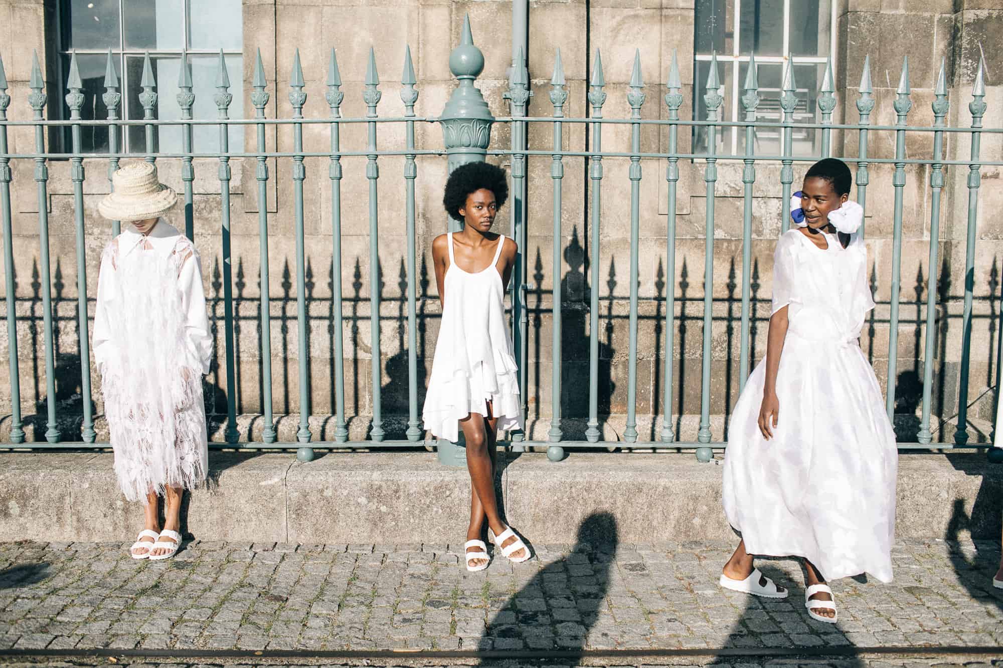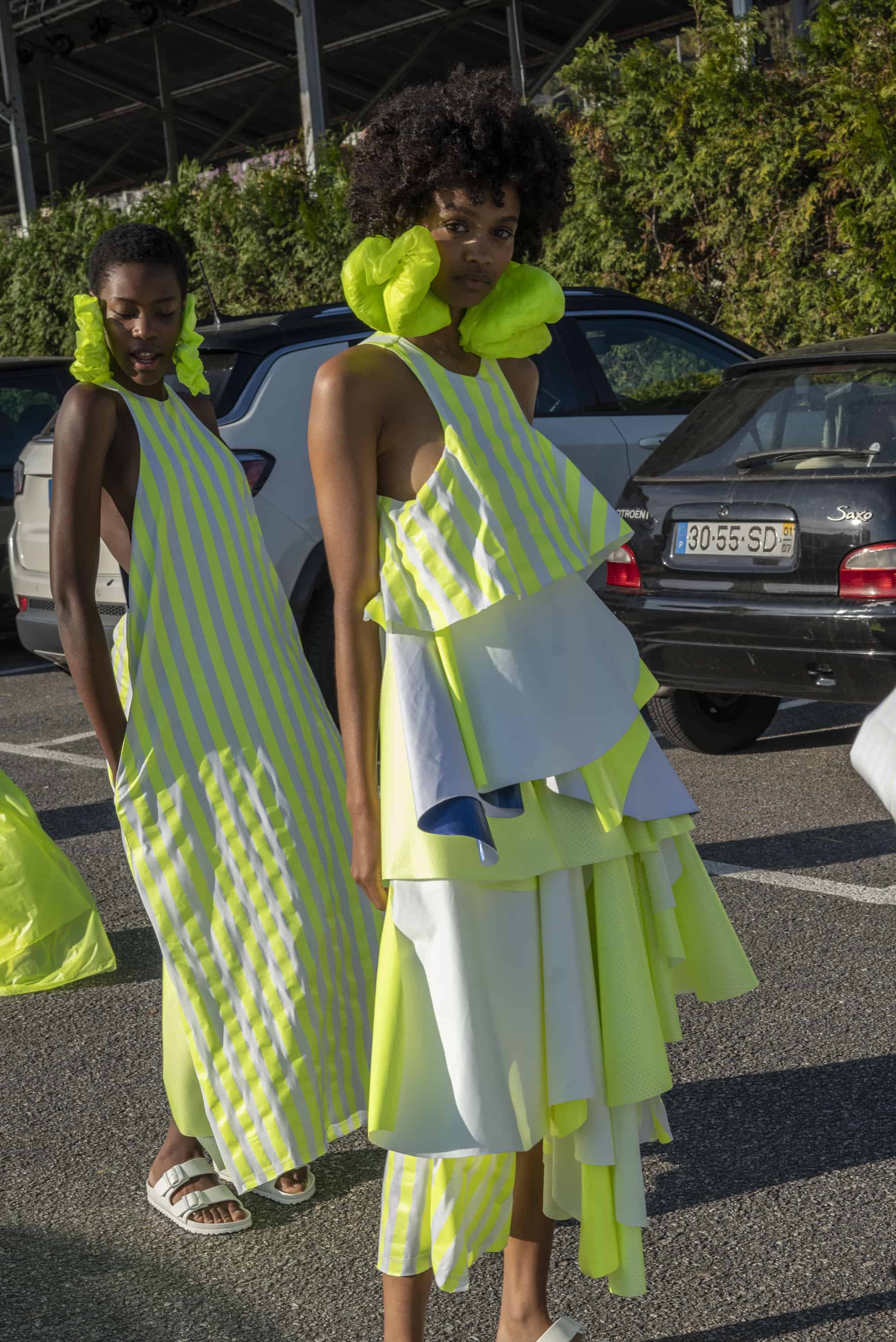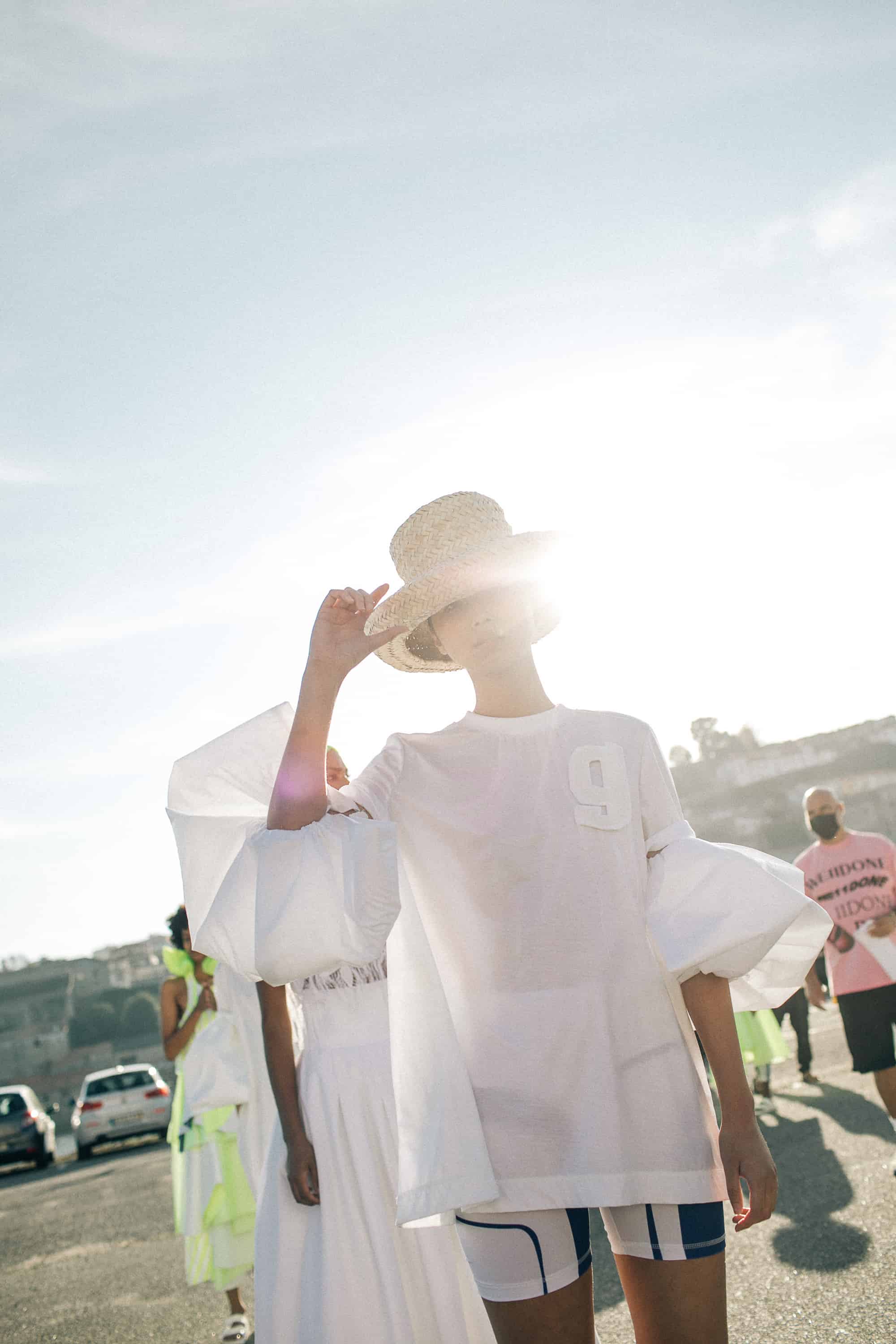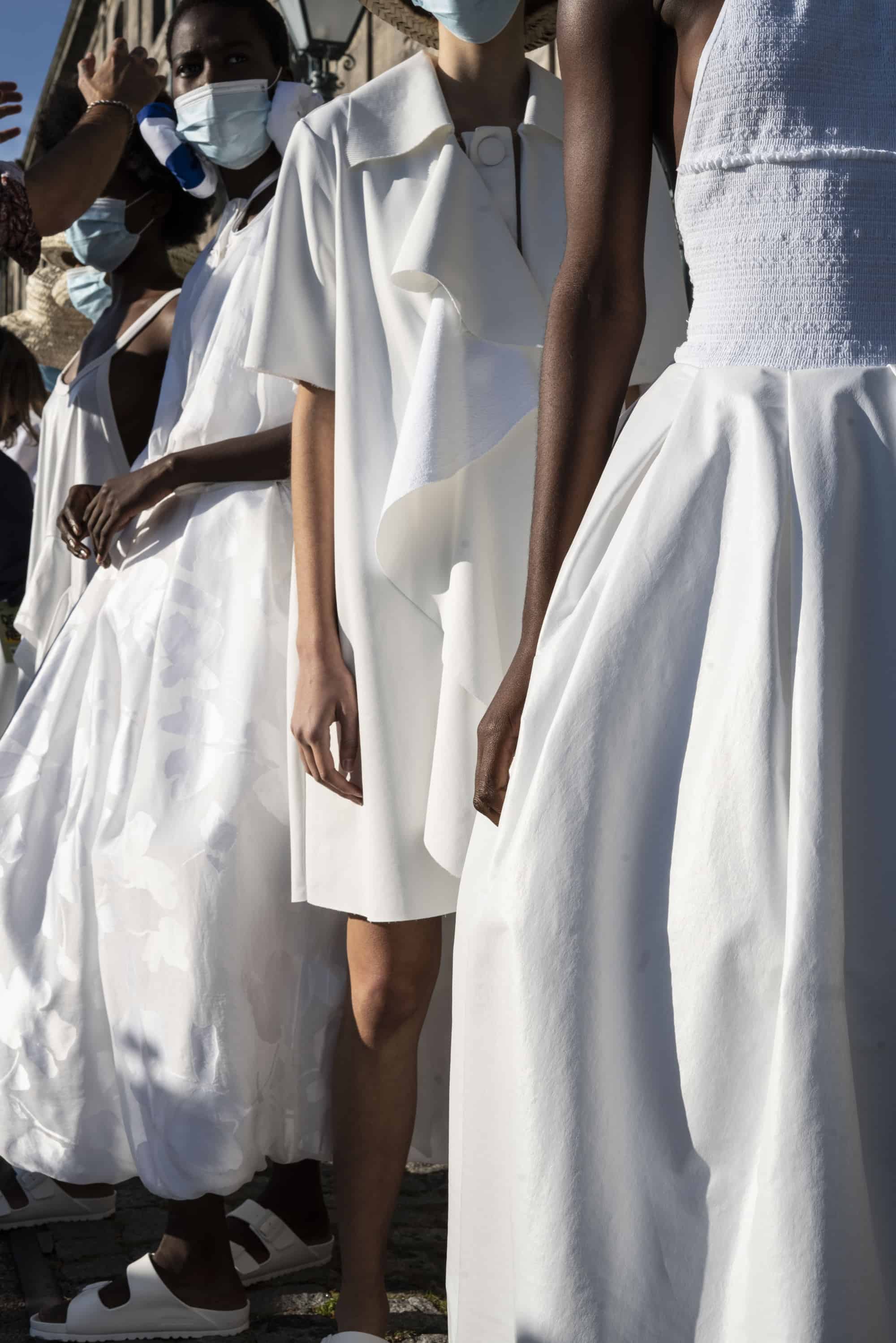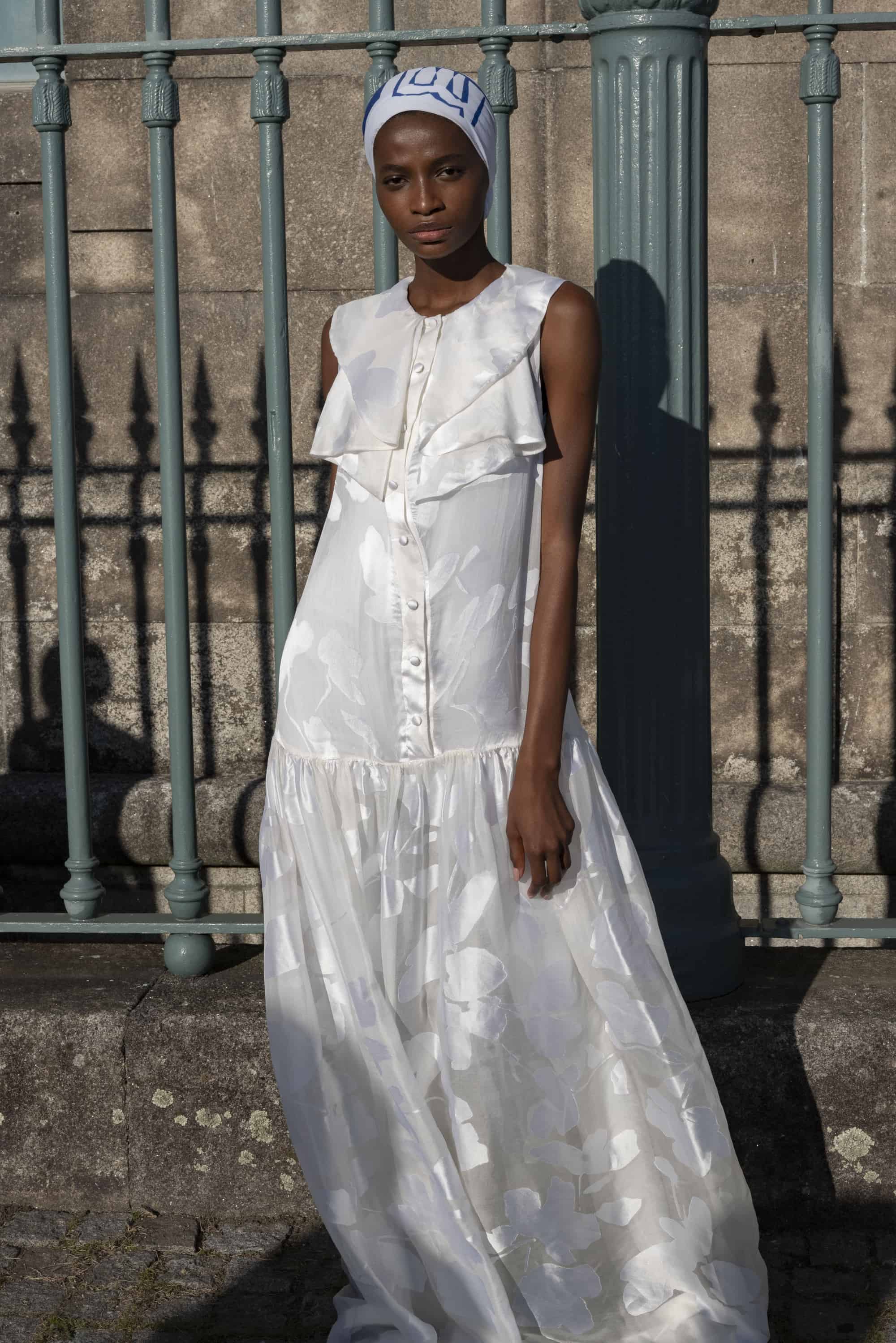 DDetalhes que nos remetem à infância como bordados em favos de mel, franzidos por elásticos, rendas e folhos jabô em camadas, polvilham as peças numa atitude delicada mas em contraste com o grafismo sport da coleção, de elementos que nos levam a Olimpíadas de natação assim como com a utilização de materiais sustentáveis e contemporâneos.