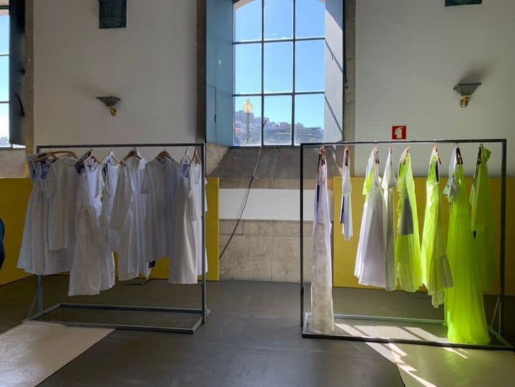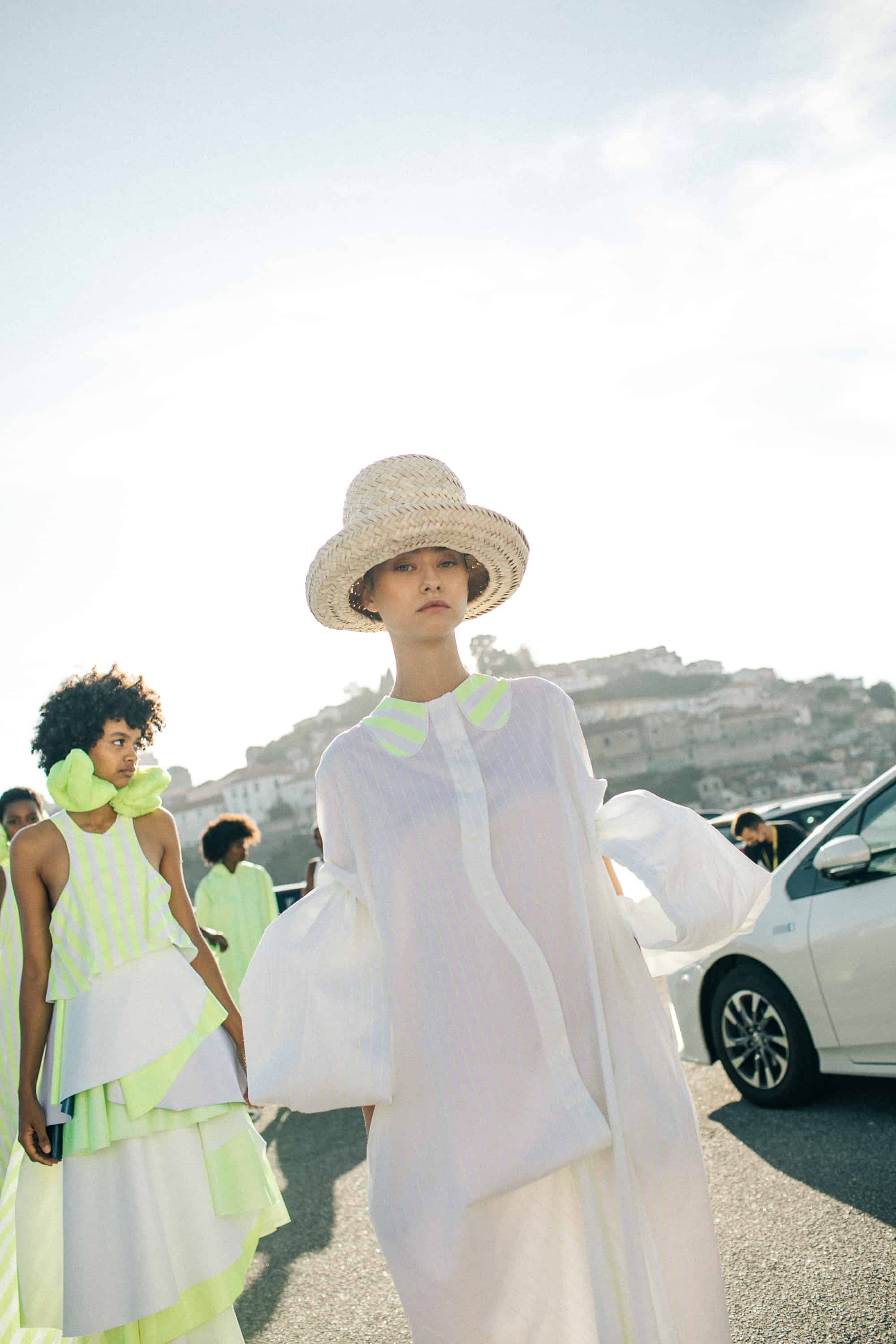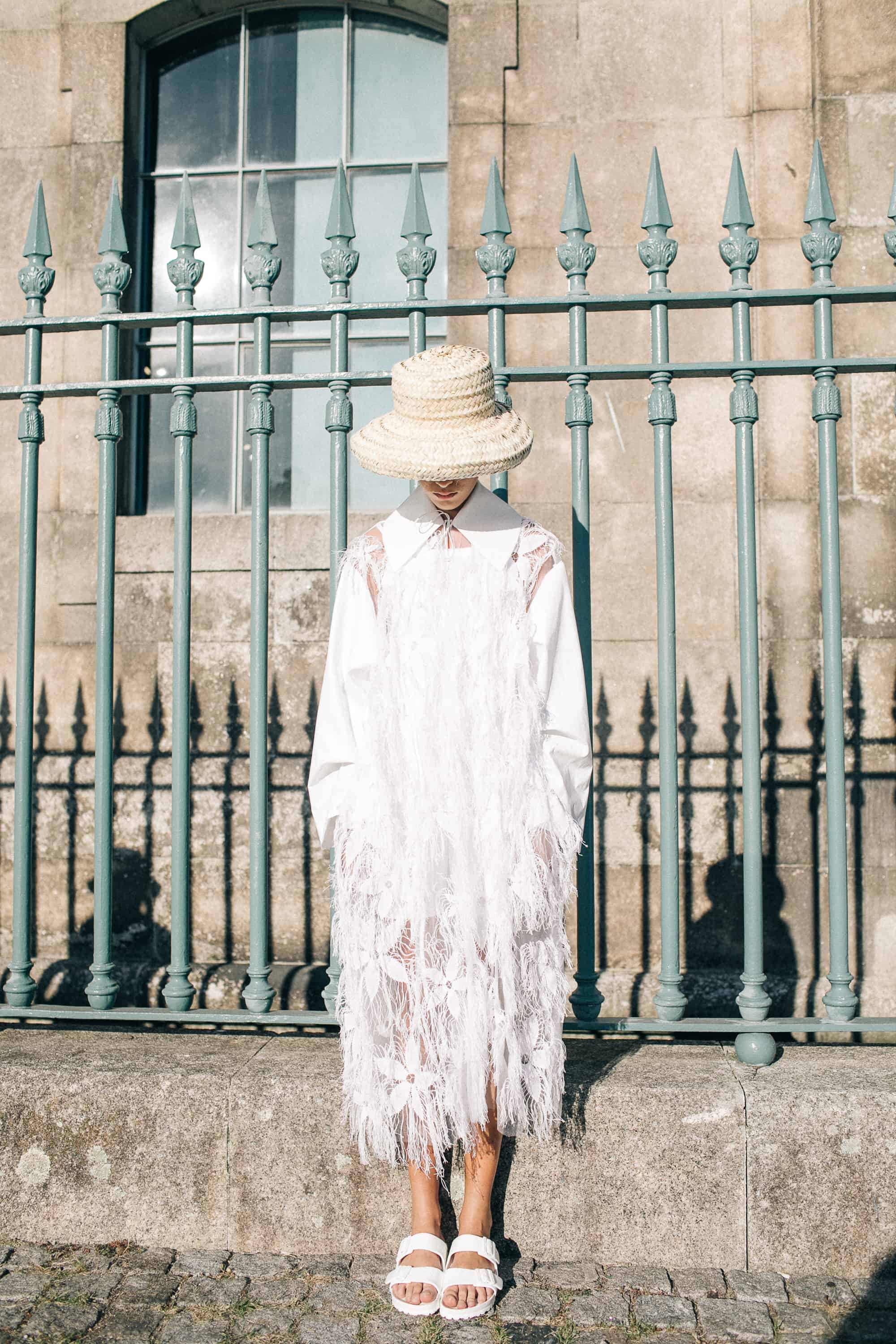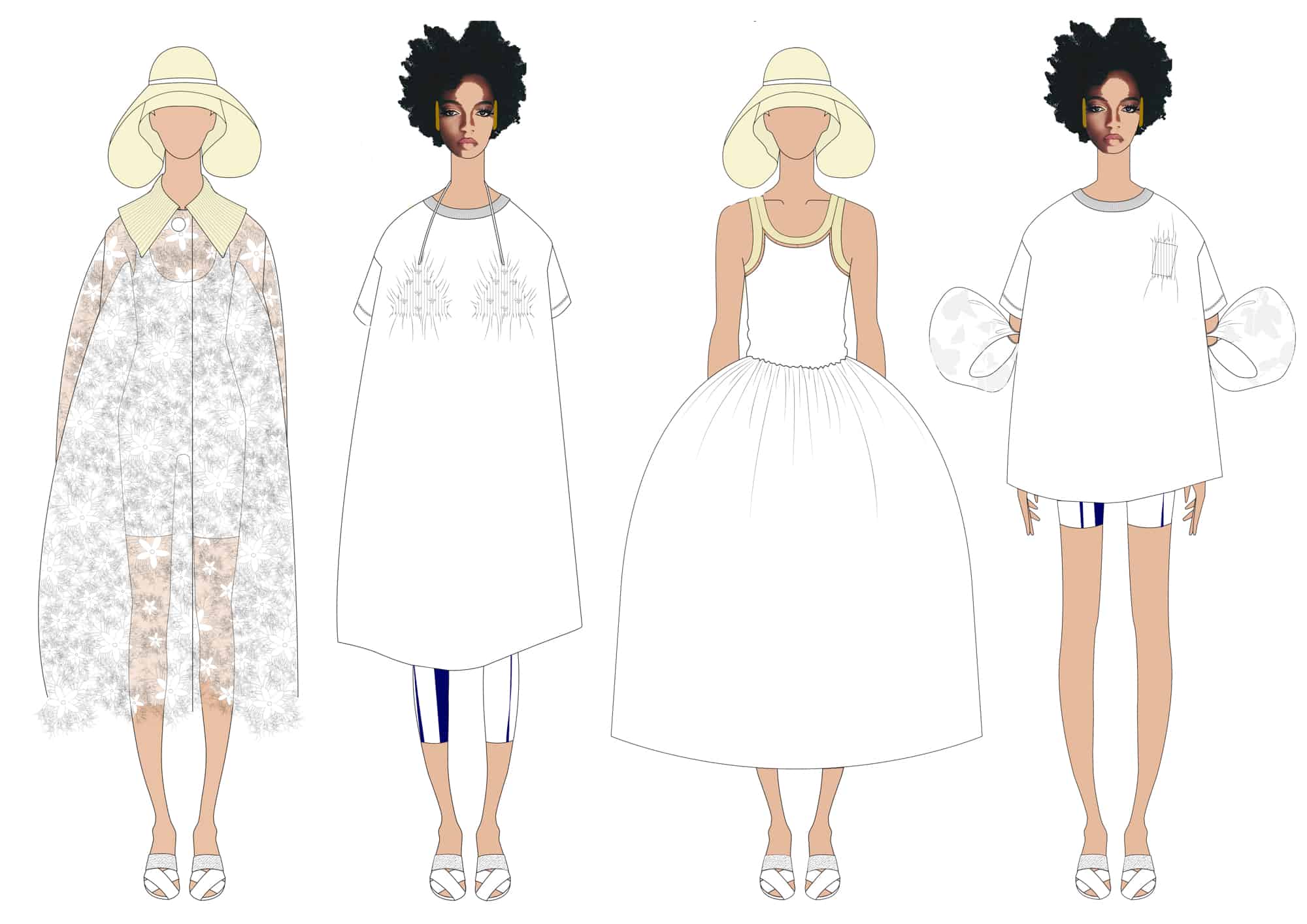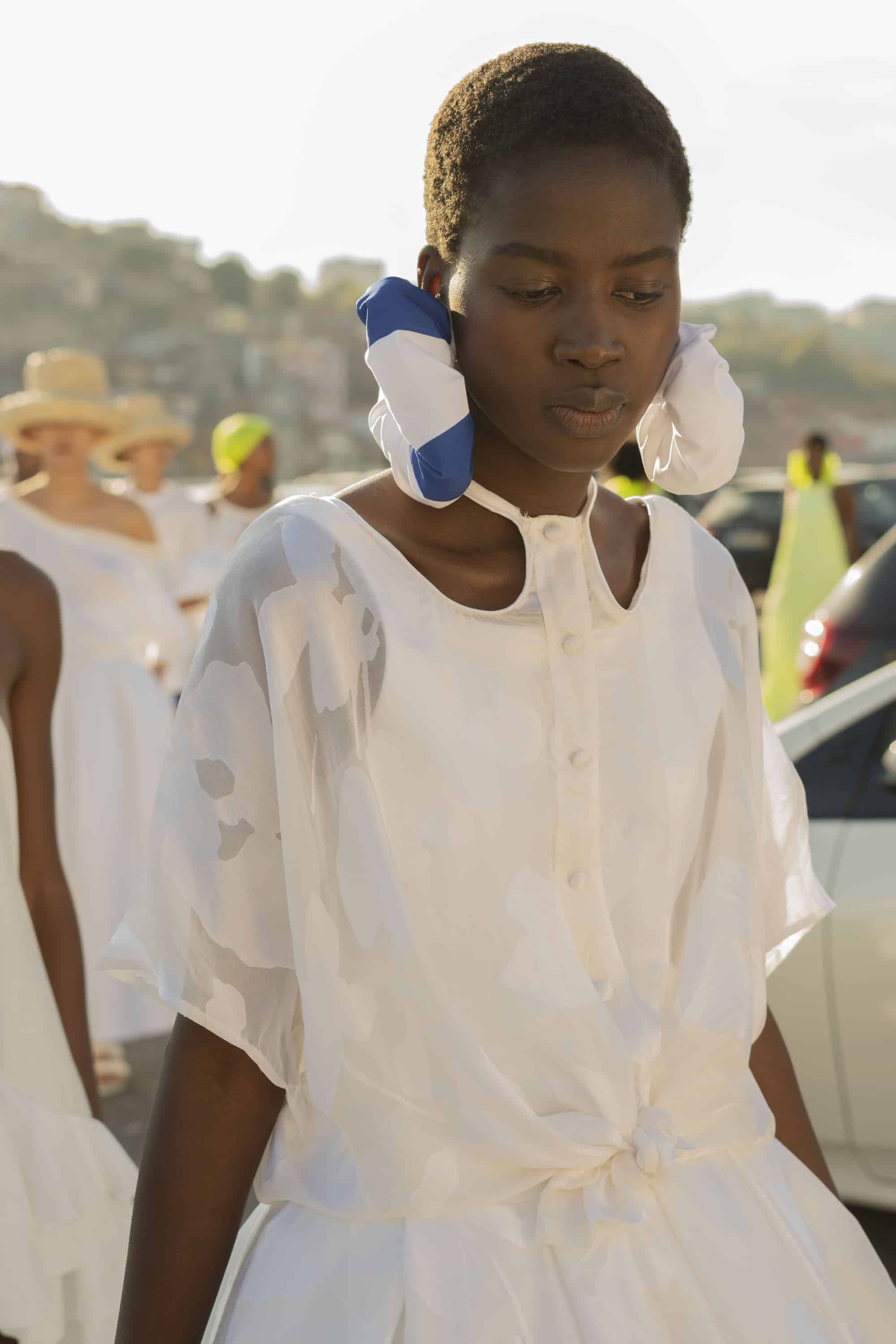 DDetalhes que nos remetem à infância como bordados em favos de mel, franzidos por elásticos, rendas e folhos jabô em camadas, polvilham as peças numa atitude delicada mas em contraste com o grafismo sport da coleção, de elementos que nos levam a Olimpíadas de natação assim como com a utilização de materiais sustentáveis e contemporâneos.