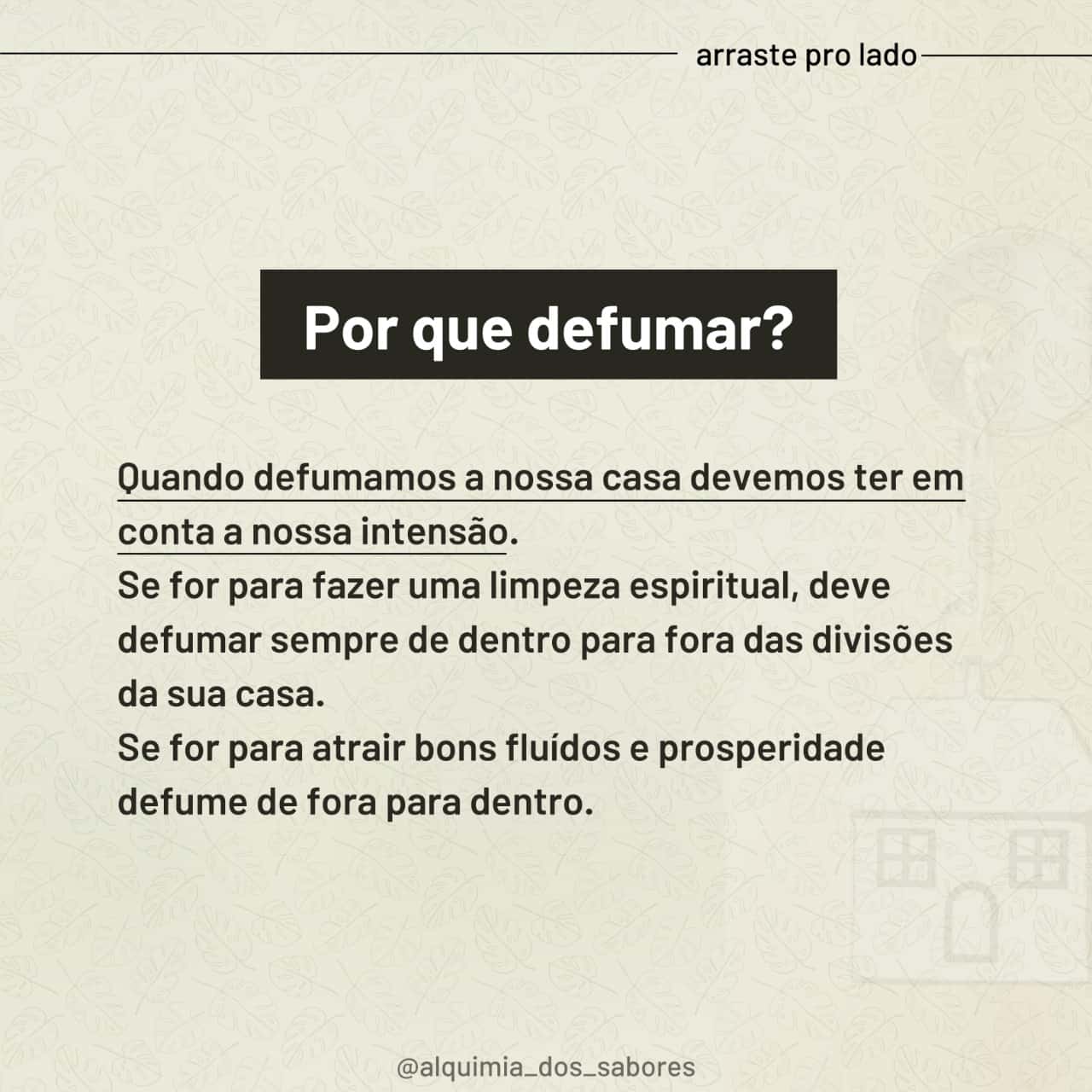 • O ideal é que primeiro defume a sua casa, fazendo apenas a limpeza, de dentro para fora. Depois, use as ervas para atrair coisas boas, de fora para dentro.