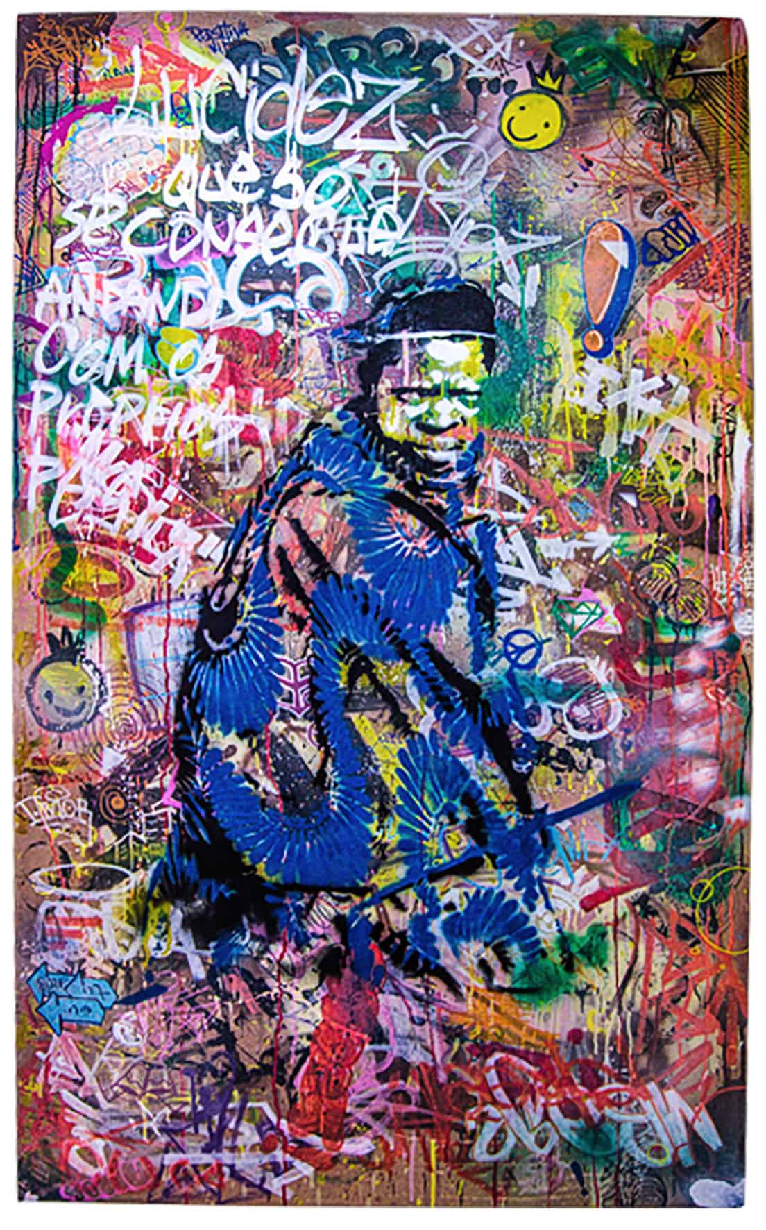 Simões paints, makes collages, creates urban and digital art, performances, installations, movies and photography, but the work does not follow a component or trend that clearly identifies a particular style.